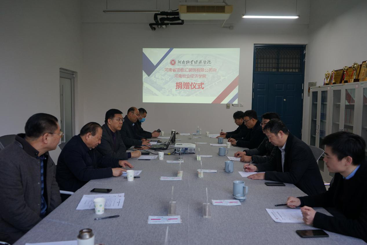 12月10日上午,我校校企合作单位河南省顶级汇装饰设计有限公司与学校签订资金捐赠协议,该公司捐赠50万元用于产业学院建设工作。仪式在龙子湖校区一号教学楼200-1室举行,副校长张卫宪、“顶极汇”有限公司董事长熊书国、总经理孙希明等领导出席仪式,校财务处、社会服务办公室负责人,tyc41183太阳成集团领导班子成员等同志参加,签字仪式由社会服务办公室主任胡迎利主持。