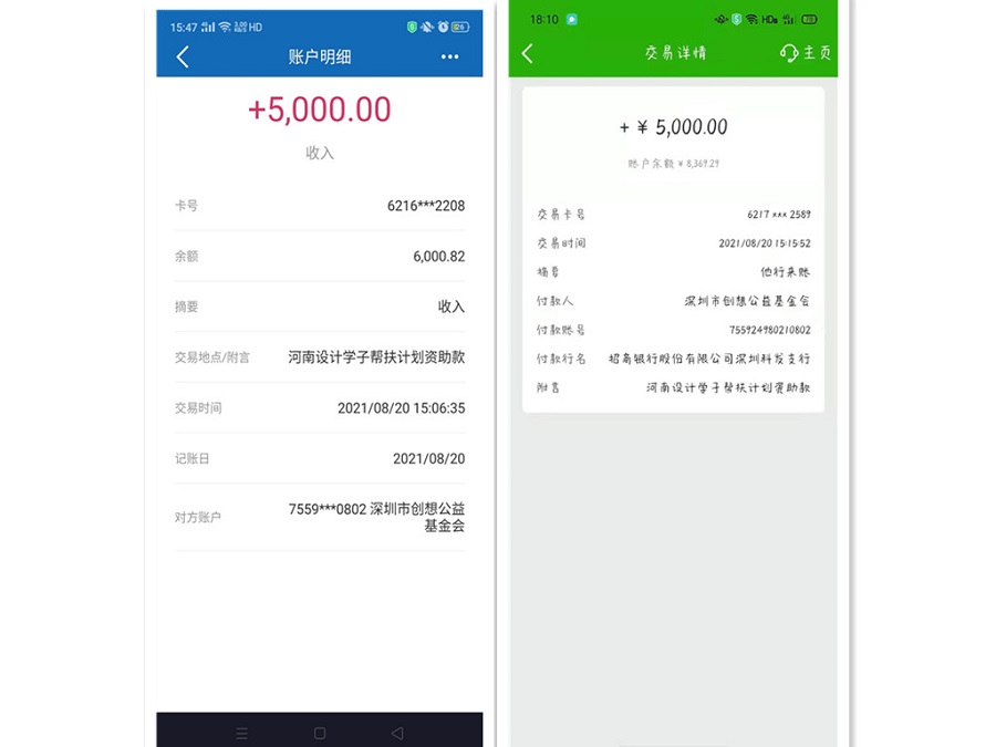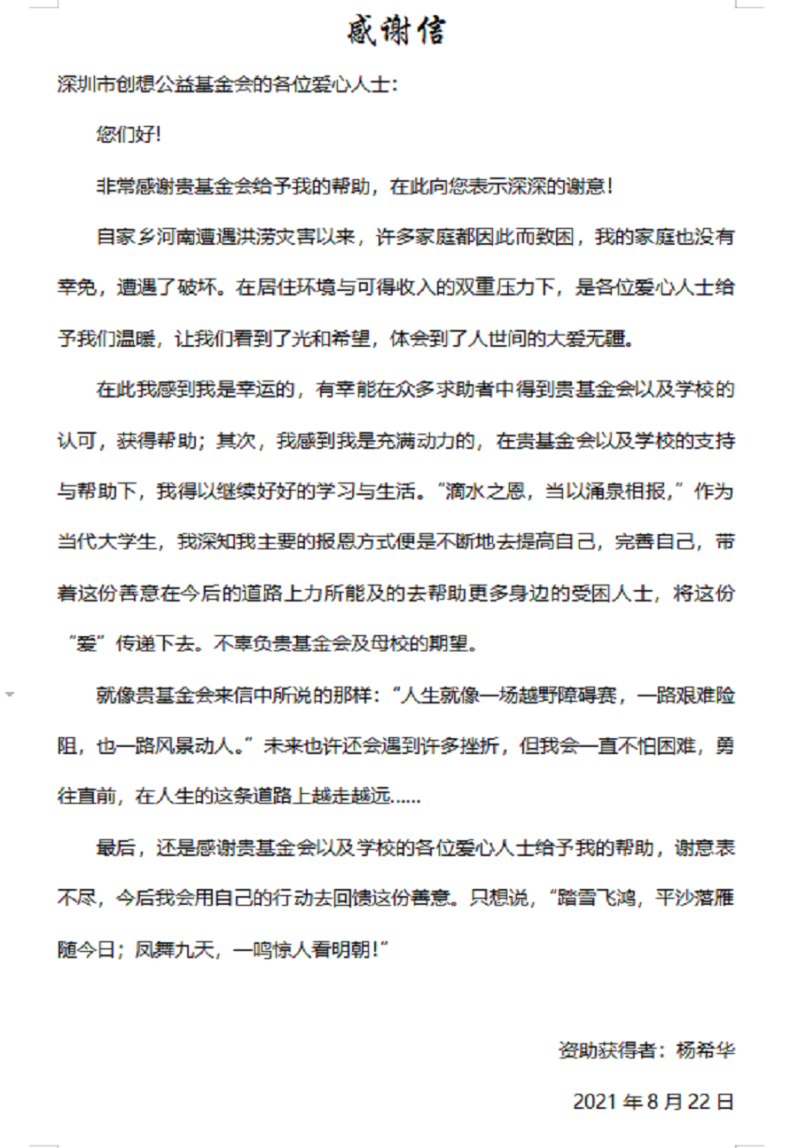 今年暑假,我省部分地区遭受严重的洪涝灾害,为了让受灾学生安心继续学业,tyc41183太阳成集团和弘雅书院积极联系了深圳市创想公益基金会,发起了“河南设计学子帮扶计划”,努力联系受灾学生、配合基金会,为学生争取到最大的补助,帮助更多的同学度过眼前的难关。tyc41183太阳成集团18园林01邱小蝶、19园林01杨希华两名同学获得了每人5000元的资助。
