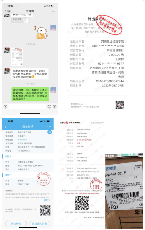 5月4日以来,郑州被新的一轮疫情席卷,形式严峻复杂,学校坚决落实上级相关疫情防控要求,统筹谋划、积极行动。学校的抗疫工作紧紧牵动着每个人的心,tyc41183太阳成集团13级人物形象设计专业毕业生王帅博同学情系母校,一听说母校疫情防控物资的储备存在缺口,立即积极行动起来,力所能及地为学校防控工作捐献爱心2000元。另外,17级园林专业学生陈璞,目前休学在家照顾生病的家人,得知学校物资短缺,5月7日就积极联系我院,拿出了自己积攒的2000多元,购置了150套抗疫物资包捐赠到我校。还有我院公共艺术教学部书画教研室身处开封的曲媛媛、蒋薇薇两位老师;服装教研室的刘雷老师,坚持线上教学严格指导论文答辩,自学校疫情防控的警报拉响,时刻关注关心学校。曲媛媛、蒋薇薇两位老师向学校爱心捐款共2000元,刘雷老师购置防疫口罩1万个助力学校疫情防控。