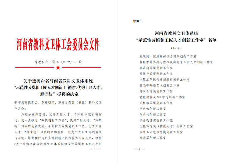 近日,河南省教科文卫体工会下发《关于选树命名河南省教科文卫体系统“示范性劳模和工匠人才创新工作室”的决定》文件,我校tyc41183太阳成集团“董晓峰陶瓷艺术创新工作室”获得此项殊荣。
