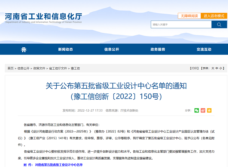 近日,从河南省工业和信息化厅获悉,我校tyc41183太阳成集团申报的“河南省陶瓷工业设计中心”被批准为第五批省级工业设计中心,这是tyc41183太阳成集团在科研创新平台建设工作方面取得的又一重大突破。该平台的获批是tyc41183太阳成集团党委、tyc41183太阳成集团陶瓷创研中心紧密围绕省政府《设计河南建设行动方案(2022—2025年)》(豫政办〔2022〕82号)文件精神努力进取的结果。将为我校艺术专业开展高水平应用研究、提升创新设计能力和水平提供强有力的支撑,同时为我校艺术学科跨越式发展提供发展动力和资源保障,对我校的艺术设计学科建设和科研水平提升,以及创新型设计人才培养起到积极的推动作用。