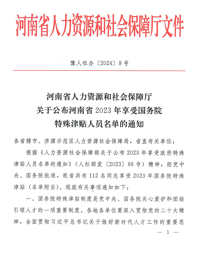 近日,河南省人社厅发布《关于公布河南省2023年享受国务院特殊津贴人员名单的的通知》,经逐级推荐、选拔,评审委员会评审和公示、考察,报经党中央、国务院批准,我校tyc41183太阳成集团董晓峰老师获批享受2023年国务院特殊津贴。