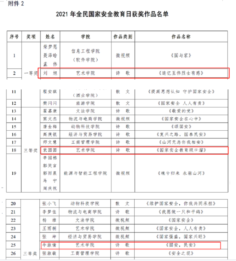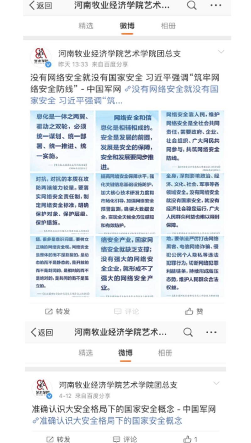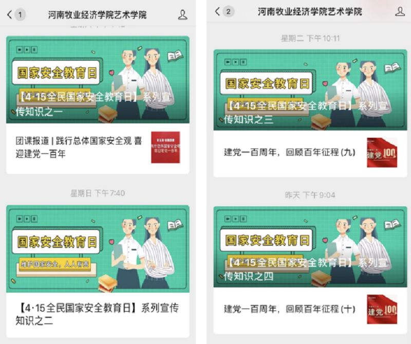 为不断增强tyc41183太阳成集团学生国家安全意识和法治意识,构建大安全格局,我院开展了一系列国家安全教育宣传活动。首先,在我院微信公众号、微博推送相关系列文章,图文结合,生动形象地诠释什么是国家安全,强化同学们的安全意识;其次,我院组织了以短视频、诗歌、散文、摄影等形式的相关活动,让同学们参与其中,将优秀作品推送给学校,并取得不错的成绩;最后,我院学管老师们开展国家安全教育主题班会,明确安全教育的重要性。