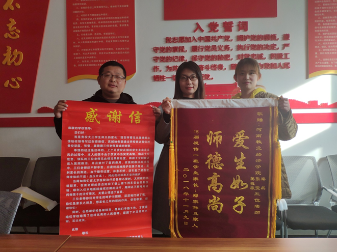 “爱生如子,师德高尚”。 不仅是对学校的肯定和鼓励,更是一种鞭策、激励。11月12号上午,两位心情激动的家长把锦旗和感谢信交到tyc41183太阳成集团的领导手中,感谢视觉传达教研室姜薇薇、张莹、梁磊三位老师的爱心关怀。