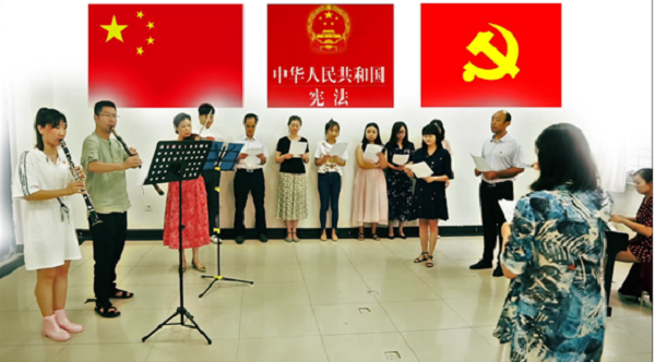 活动上,在黑管、小提琴和钢琴声的伴奏中,在王在钦书记和我院青年教师杨白雪领唱下,tyc41183太阳成集团部分教师党员共同演唱歌曲《宪法,我想对您说》。歌声声声入耳,深深触动着每一个党员的内心,歌曲唱出了大家对国家的爱,对《宪法》的崇敬和拥护。