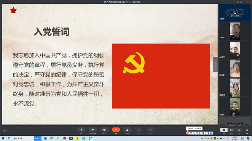 活动的后半部分,第一项内容是“重温入党誓词”。同学们面对中共党旗,在党支部书记卢晓靖老师领誓下,举起右拳,庄严宣誓,重温入党誓词。“我志愿加入中国共产党,拥护党的纲领,遵守党的章程,履行党员.....”党员同志们铿锵有力的宣誓声响彻视频会议的直播间,宣示了坚定的政治信念。
