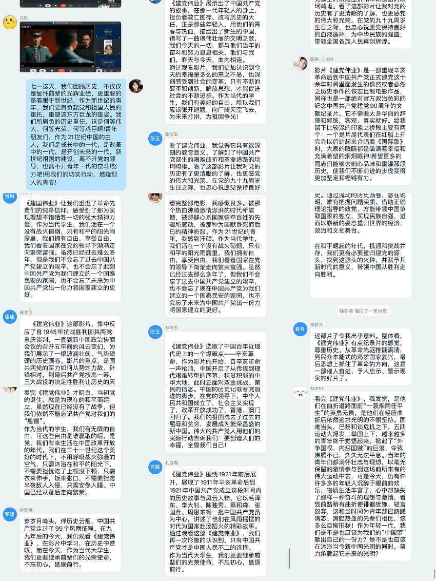 第三项内容是组织全体党员观看《建党伟业》红色经典影片。同学们纷纷表达观影感受:作为党员要永远回望那段历史记忆,承载红船嘱托,不忘我们坚持以人民为中心的初心和恒心,牢记为人民过上幸福美好的使命,发扬红船的首创精神、奉献精神、奋斗精神,坚定政治立场。提升我们自身党性修养,在平凡的岗位上进行党性锻炼,加强自身理论学习,提升综合能力,发挥党员的先锋模范作用和敢于人先的品质,无愧党员称号,无愧于这个新时代,无愧于我们的心路历程。