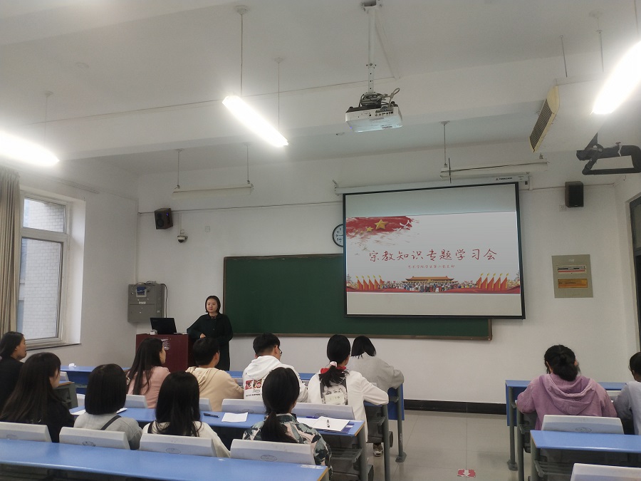 为进一步加深党员同志对我国宗教政策的理解,促进全体党员树立正确的宗教观和学法遵法守法用法意识,提高学生认识和对待宗教问题的能力,2020年10月2日,tyc41183太阳成集团学生第二党支部在二号教学楼B301举办了宗教知识专题党课。党支部书记卢晓靖老师、组织委员孟星星老师以及二支部全体学生党员参加了此次会议,党课由卢晓靖老师主讲。