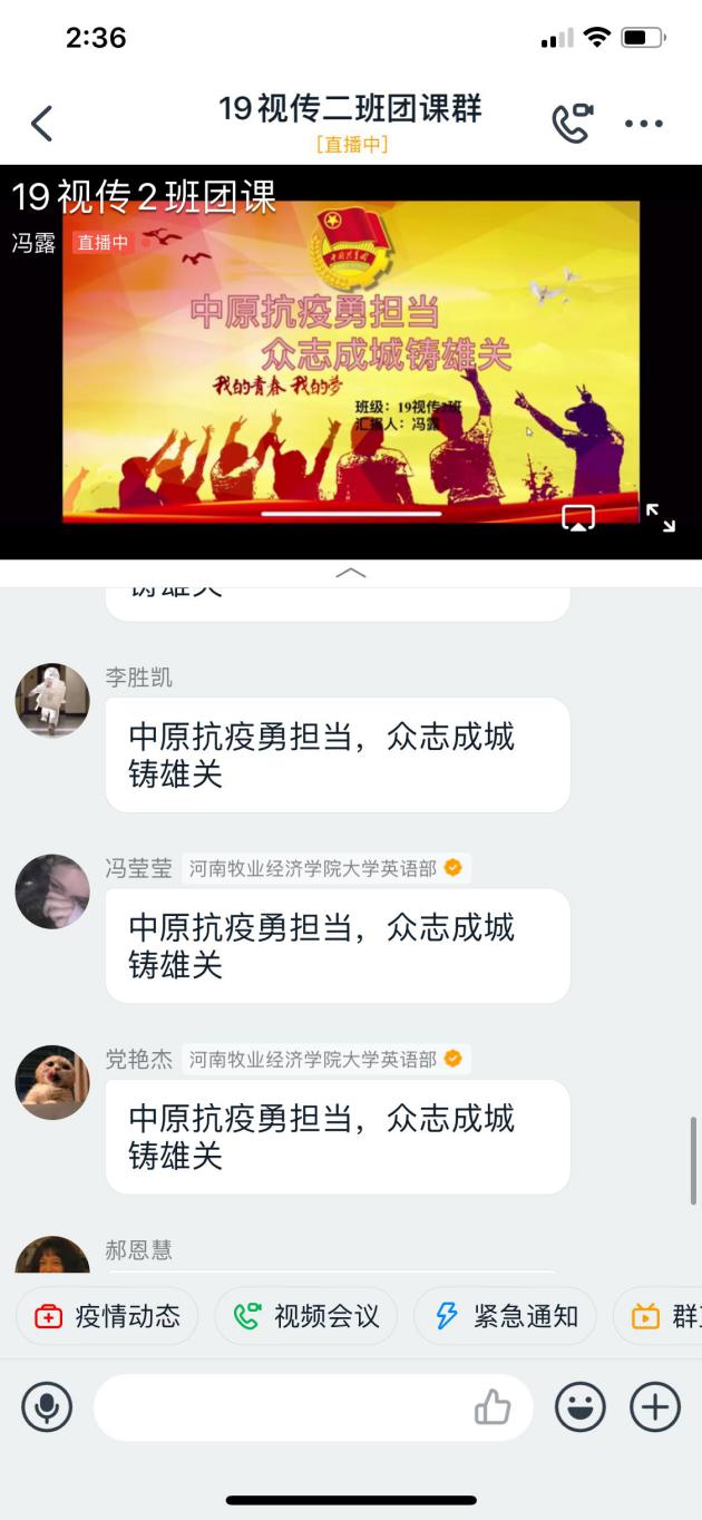 2020年5月14日下午,tyc41183太阳成集团在钉钉会议群上举行了以“中原抗疫勇担当,众志成城铸雄关”为主题的团课。本次团课,由大一全体班级参加。