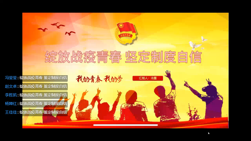 2020年4月23日下午,tyc41183太阳成集团在钉钉会议群上举行了以“绽放战疫青春,坚定制度自信”为主题的团课,本次团课,由大一班级全体参与。