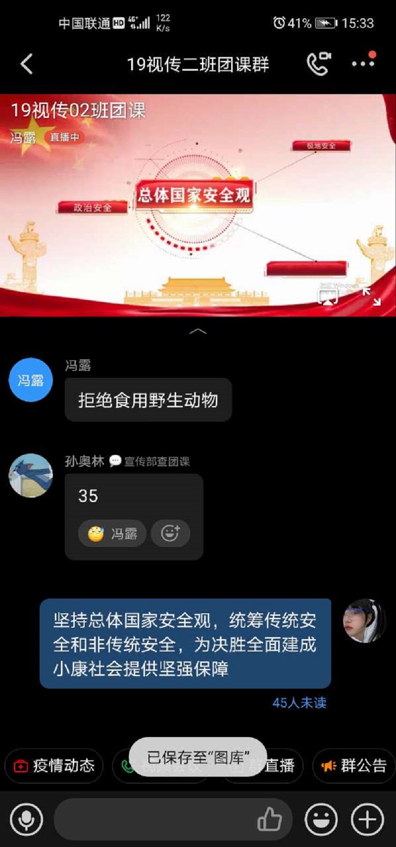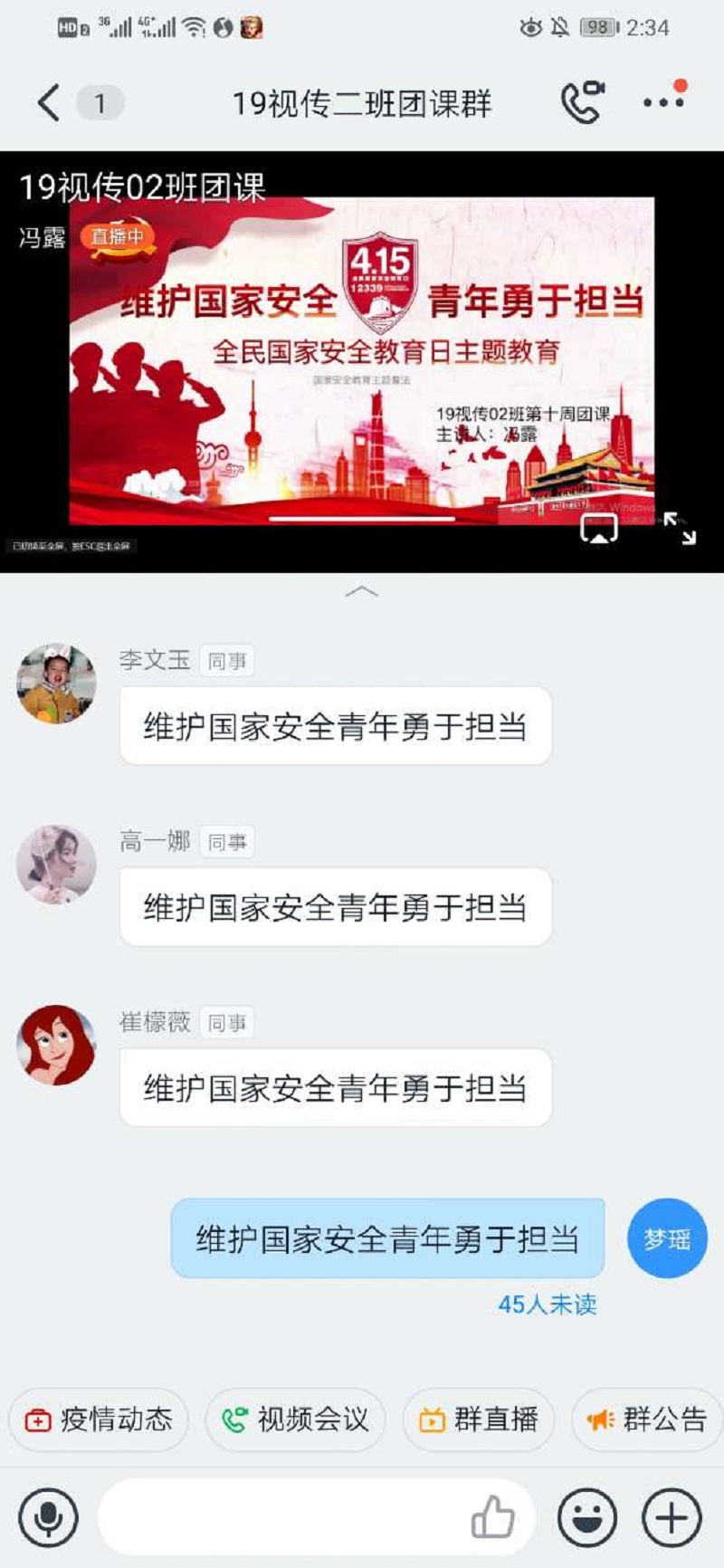 2020年4月15日下午,tyc41183太阳成集团在钉钉会议上举行了以“维护国家安全,青年勇于担当”为主题的团课,本次团课,由大一全体班级参加。