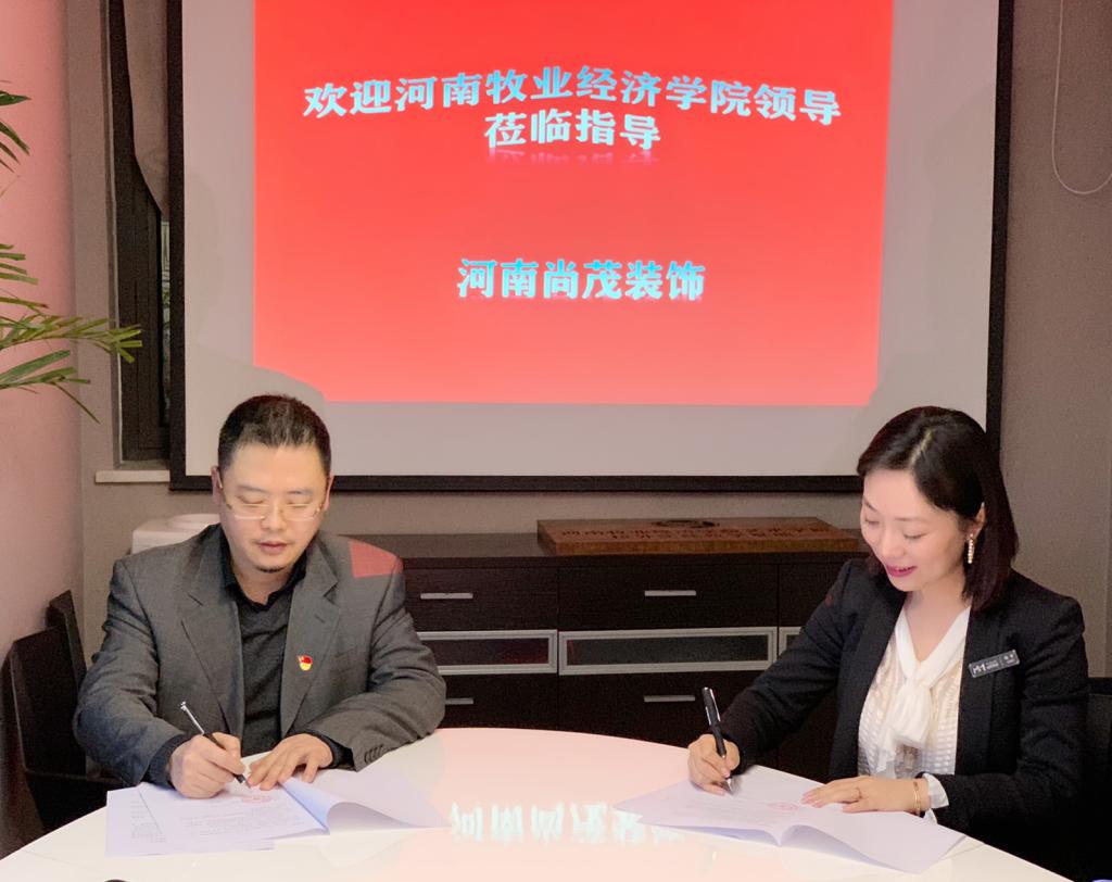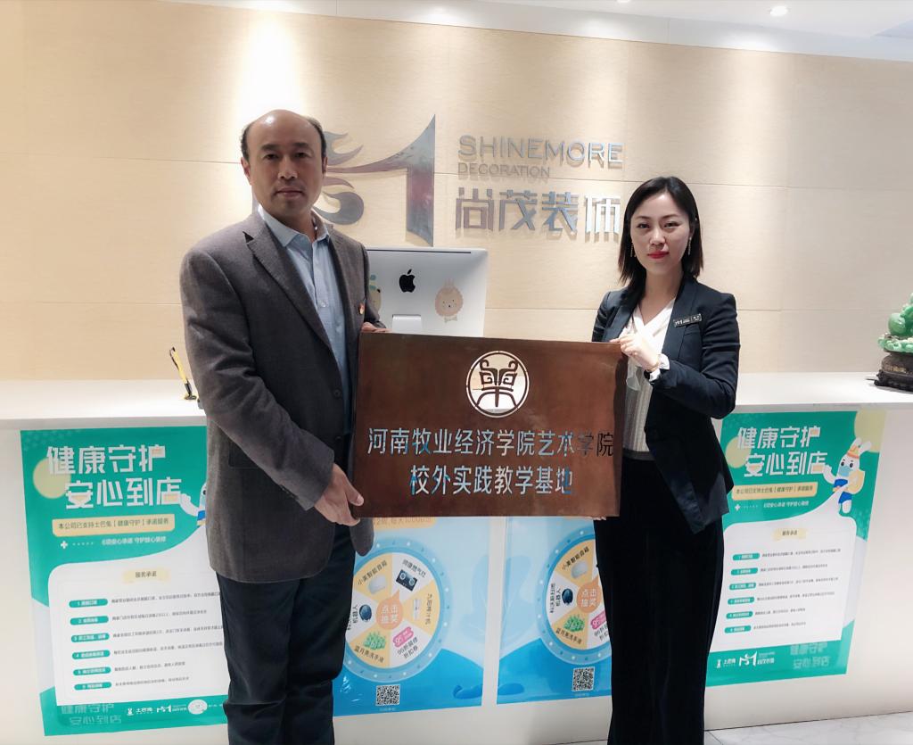 为深入推进产学结合教学模式的运行,为学生提供良好的实训实习平台,2020年4月24日下午,tyc41183太阳成集团与河南尚茂装饰工程有限公司校企合作签约仪式在尚茂公司举行,尚茂公司总经理刘进婷、设计总监张大磊、tyc41183太阳成集团王在钦书记、张鹏院长、田志涌副院长、环境设计教研室主任谭丛、副主任李莉参加签约挂牌仪式。